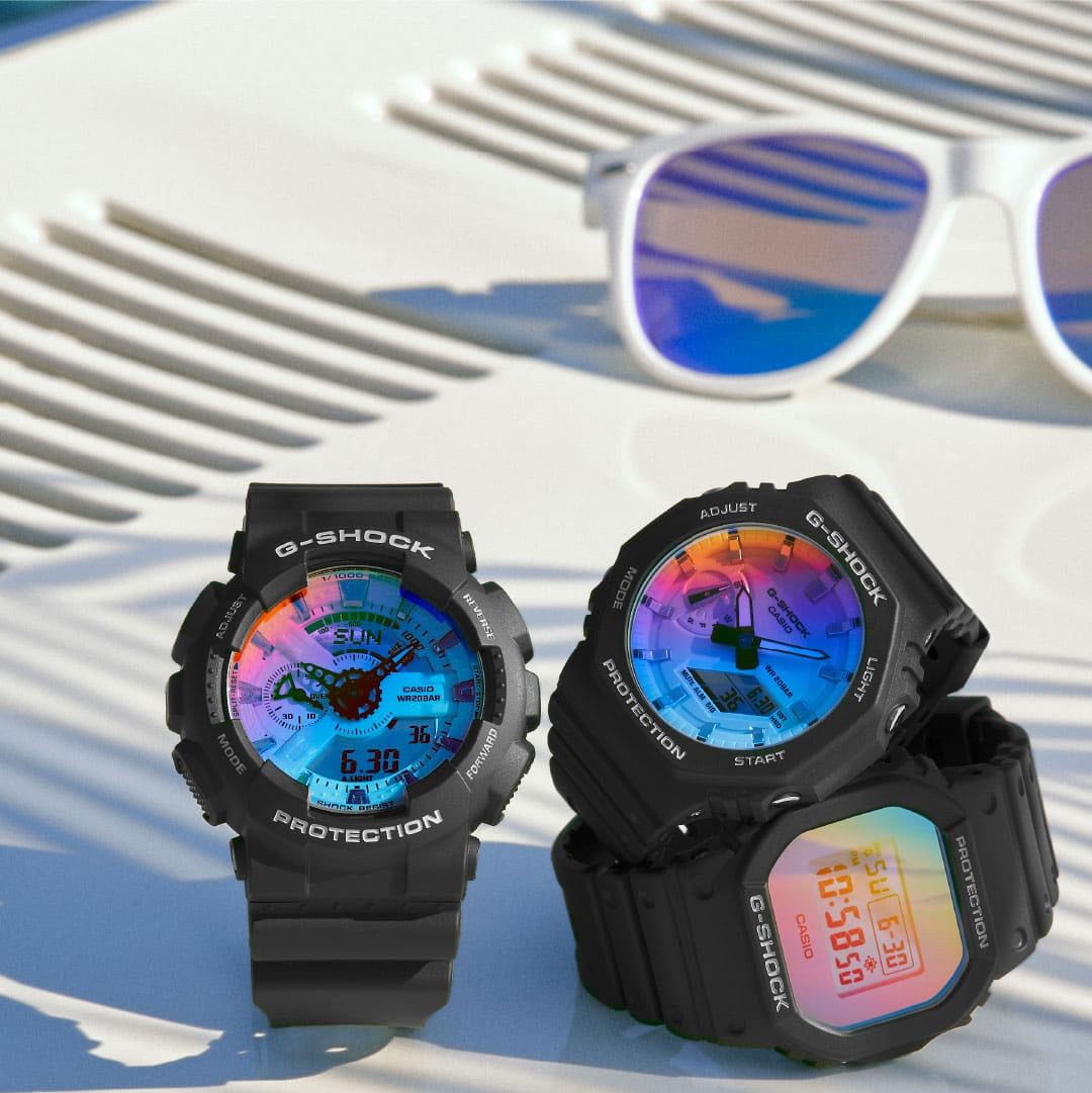 Déjate seducir por los colores iridiscentes: el primer G-shock con cristal multicolor que cambia según el ángulo de visión. Reproduce los tonos del cielo al atardecer, haciendo que cada reloj sea único. *El color real puede variar y la legibilidad puede cambiar según el ángulo.